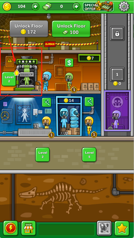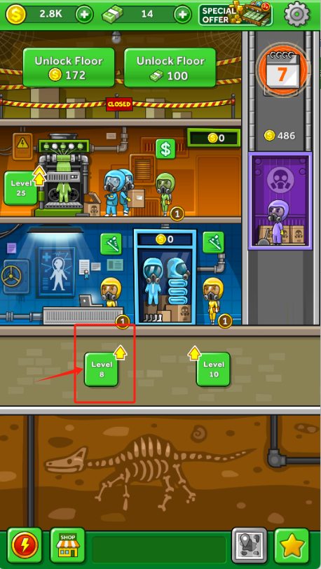 1、点红框里的Unlock Floor花172金币解锁新楼层,钱不够就先去赚钱。
