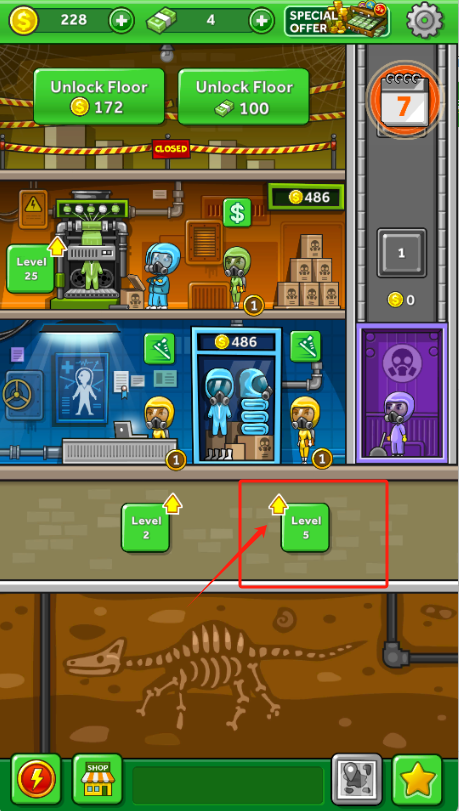 2、选Level 5开始工作,注意看红框里的电梯数字7,那是当前楼层。
