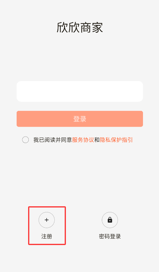 1、打开APP后,在登录页面下方找到"商家注册"选项并点击进入。