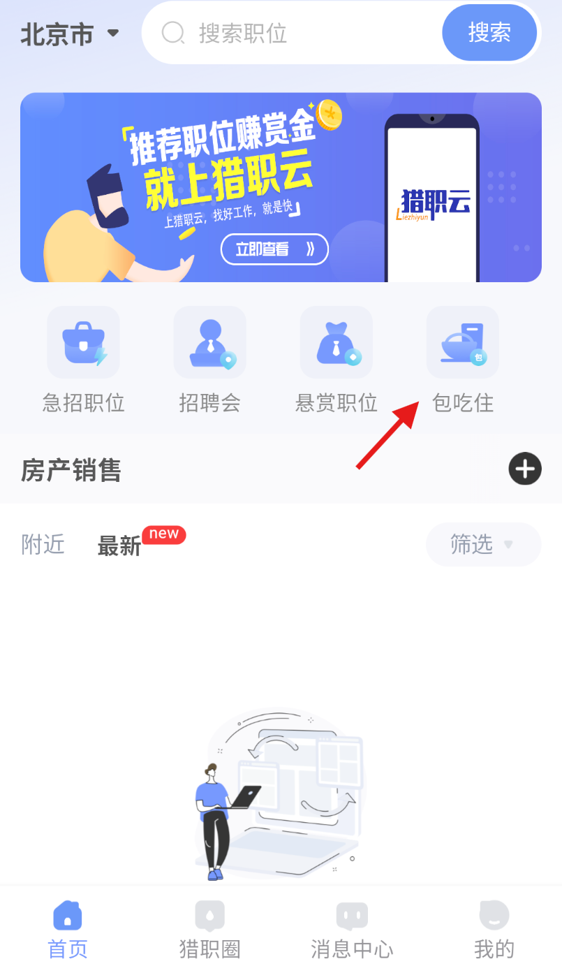 1、打开猎职云软件,在软件首页的功能选项中找到 “包吃住” 并点击,进入相关岗位。