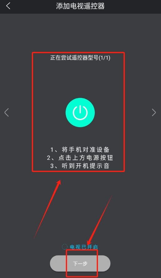 2、在对应品牌中点击电源按钮匹配,一次不成功会自动切换下一个型号多次匹配,还能选不同品牌通过蓝牙配对,确保能打开家电。