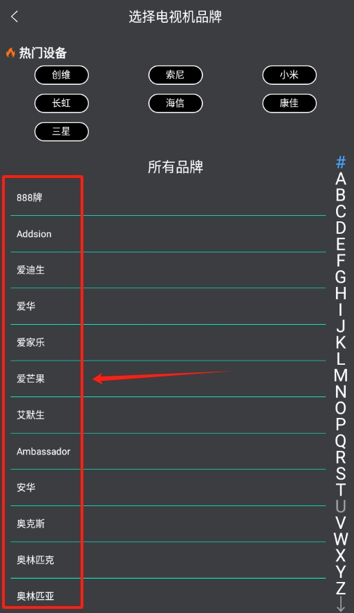 2、在显示的列表里挑选自己家电视的品牌,热门品牌会有推荐,找不到的话也能直接搜索品牌名称。