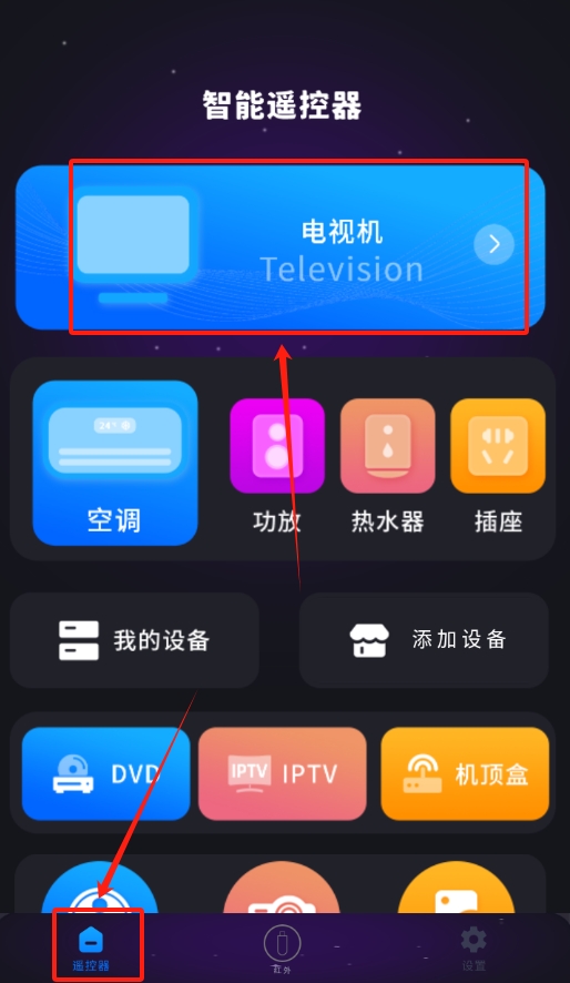 1、打开全智能家电遥控器,在首页找到电视这个选项直接点击,进入后就能看到各种可以匹配的电视相关信息了。