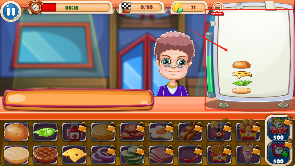 3、按照白板食材提示制作汉堡,在倒计时内完成订单获取高分奖励。