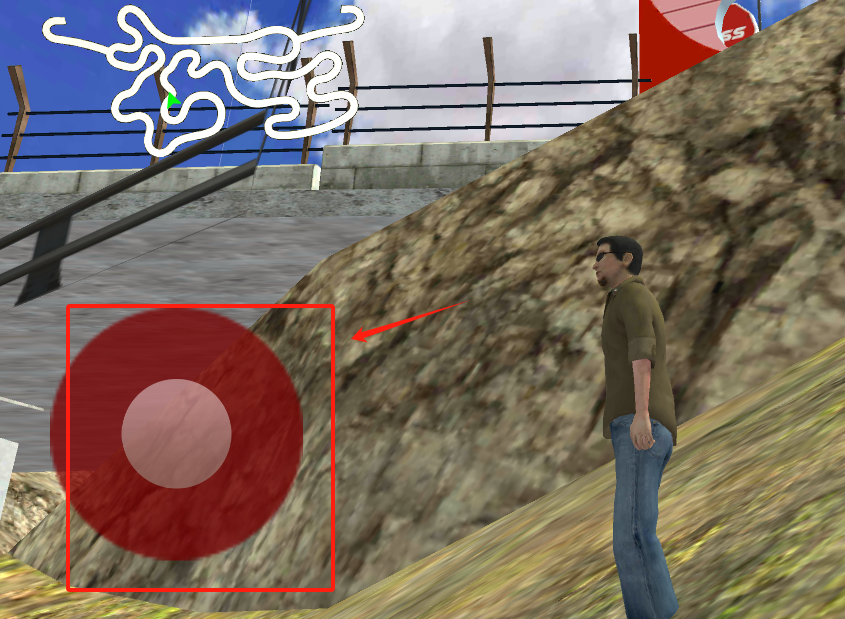 3、看到红色圆圈按钮被红框标出,点它就能让斜坡上的小人开始户外跑酷挑战啦。