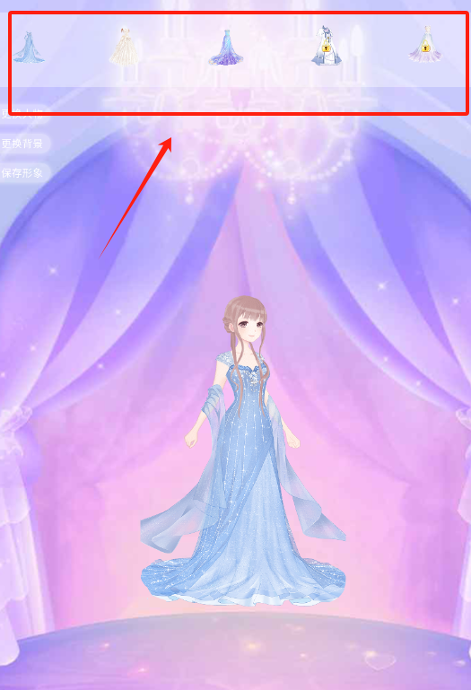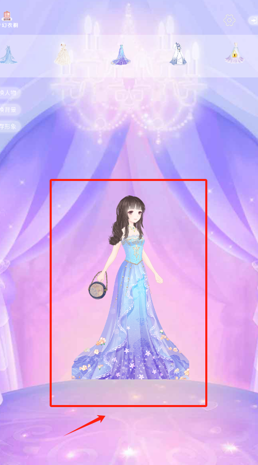 2、看到蓝裙女孩和红框服饰图标,点箭头指向的那些衣服,就能给女孩换上不同款式的服装哟。