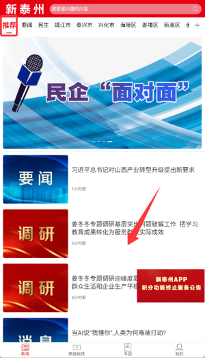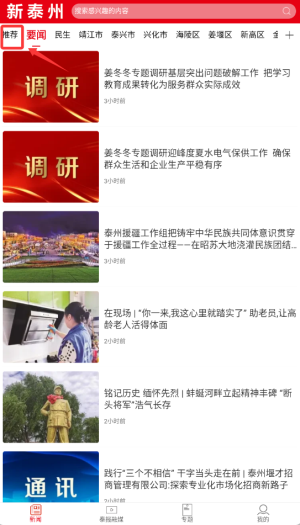 1、启动新泰州APP后,在首页导航栏点击"推荐"选项,进入精选资讯页面。