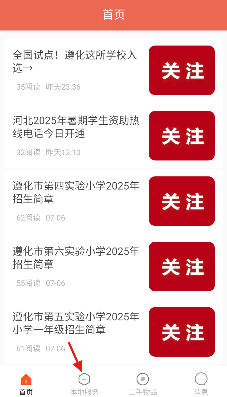 1、打开遵化生活圈最新版,在导航栏中找到 “本地服务” 并点击,进入相关页面。