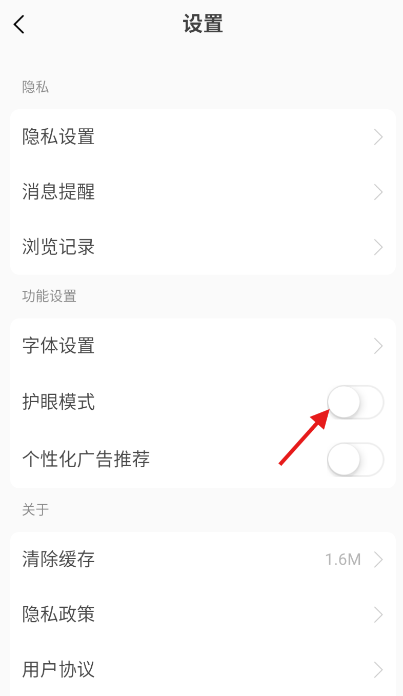4、在设置界面中,找到护眼模式选项,点击其旁边的开关,即可开启护眼模式。