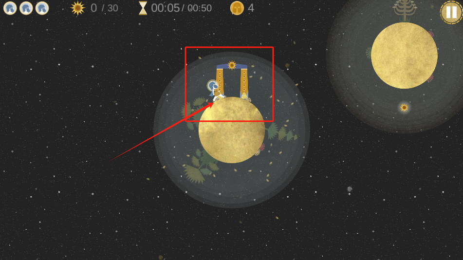 3、控制角色在黄色星球上移动,收集资源或触发星球上的机关。