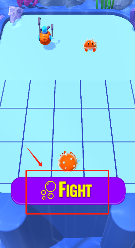 1、看到橙色小怪物和下方紫色FIGHT按钮,用手指点这个按钮,就能开始水下大战怪物啦。