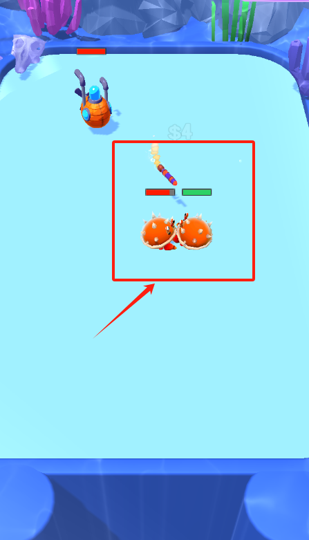 2、看到水里带刺的橙色球体和彩色条,点红框里的球体发射攻击,击退上方触角装置保护自己哟。