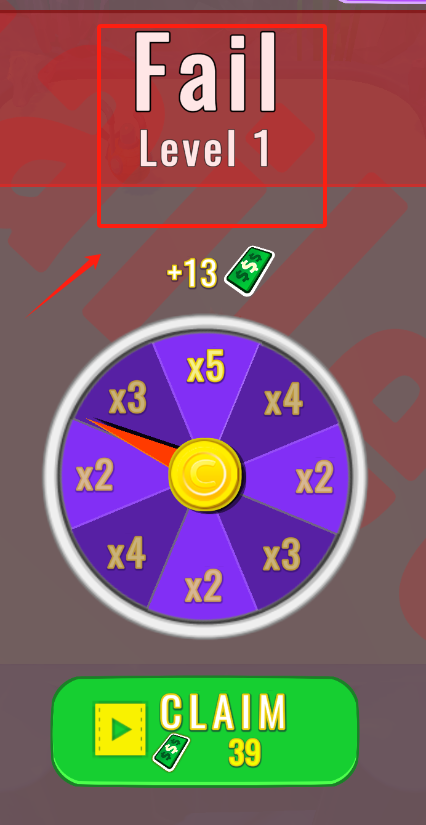 3、看到Fail Level 1紫色转盘,点底部绿色CLAIM 39按钮,就能领取失败关卡奖励金币啦。