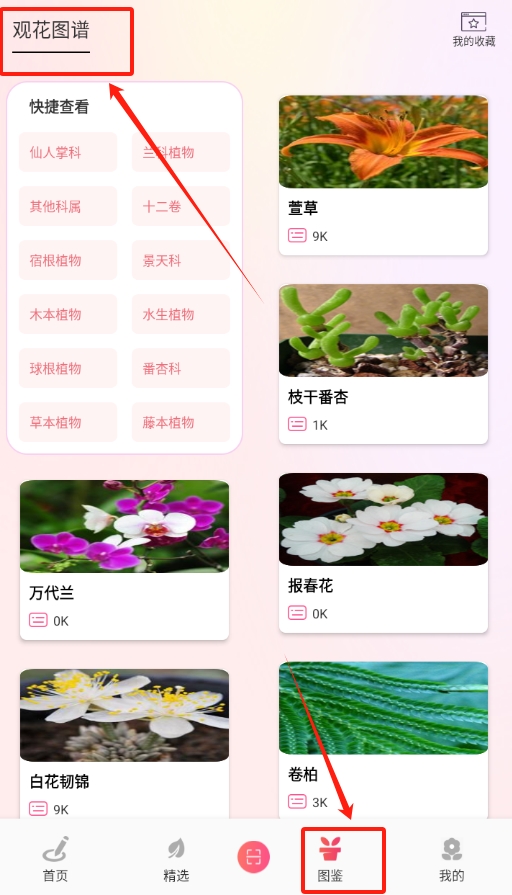 3、切换到图鉴页面,能看到各种花草的图文详情,图片清晰还附带详细介绍,想认识别花草或者了解特征,看这里就对了。