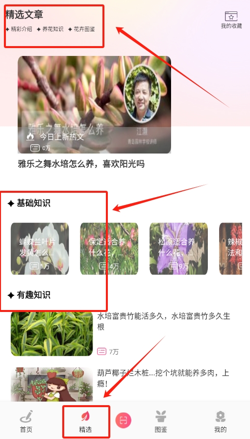 2、在软件里找到精选页面,这里有不少关于养花的知识文章,都是精心挑选的,点进去读一读能学到不少实用技巧。