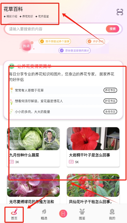 1、打开养花小助手后,首页就能看到花草百科板块,里面有各种植物的知识,想了解哪类花草,直接点进去浏览就行很方便。