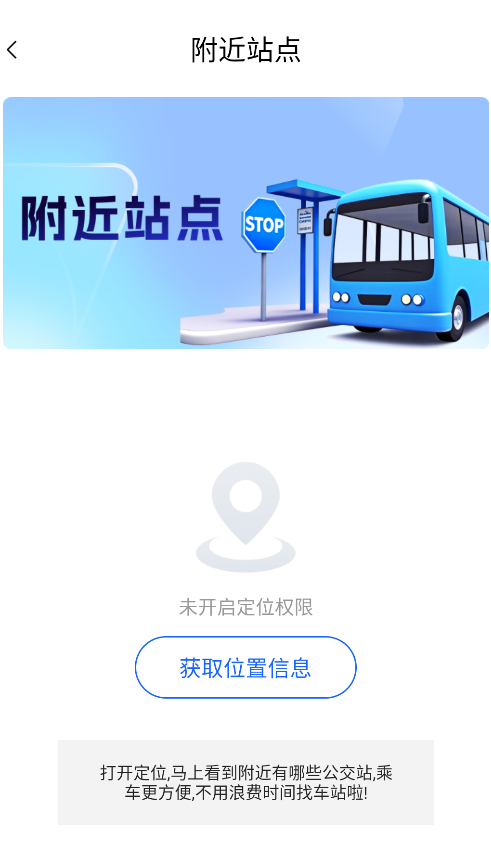 2、进入"附近站点"功能并开启定位权限后,应用会自动显示当前位置周边的公交/地铁站点及距离。