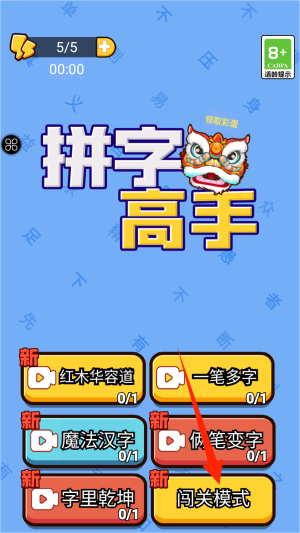 1、首次进入游戏时,选择主界面的"闯关模式"按钮开启汉字变形之旅。