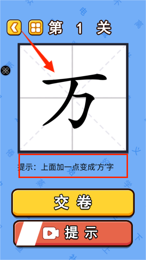 2、系统随机展示基础汉字"万",要求通过添加单笔划创造出新字形。