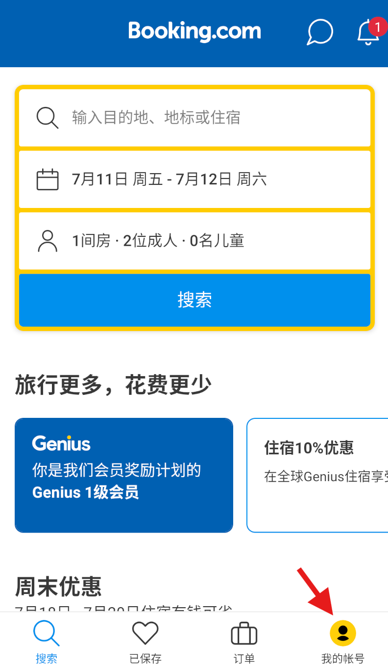 1、打开Bookingcom缤客软件,在导航栏中找到 “我的账号” 并点击,进入到与个人账号相关的页面。