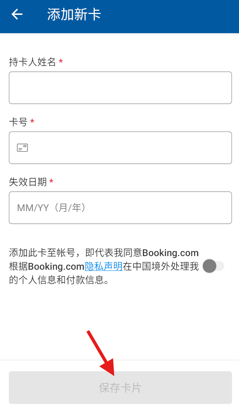 4、在该页面输入持卡人姓名、银行卡卡号以及卡片失效日期,确认信息无误后点击保存卡片即可。