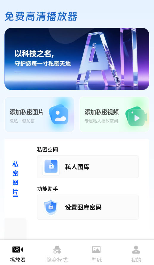 1、启动应用后,在播放器主界面可导入私人照片和视频,专属加密空间确保隐私安全,并配备实用功能助手。