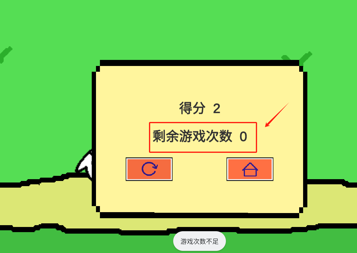 4、游戏次数用完,得分2分,点循环箭头充值次数,或点房子退出游戏。