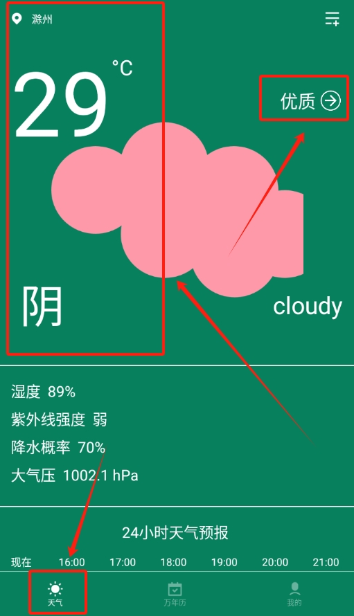 3、进入首页就能直接查看天气预报,上面信息还挺全的,想了解更多点一下优质选项,能看到更详细的内容。