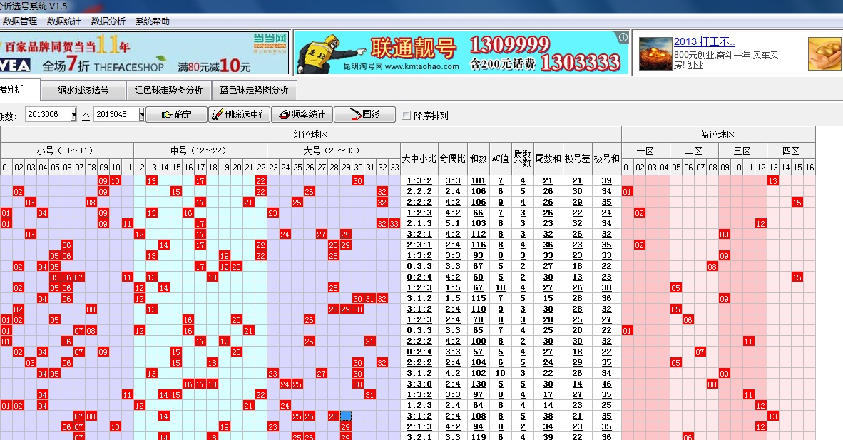 双色球分析选号系统免费使用,界面综合了市场上各种彩票工具的优点,提供全面的走势分析、号码选取、过滤与缩水、开奖核对、历史数据自动更新为一体功能,界面简单清晰直观易用,操作简单,...