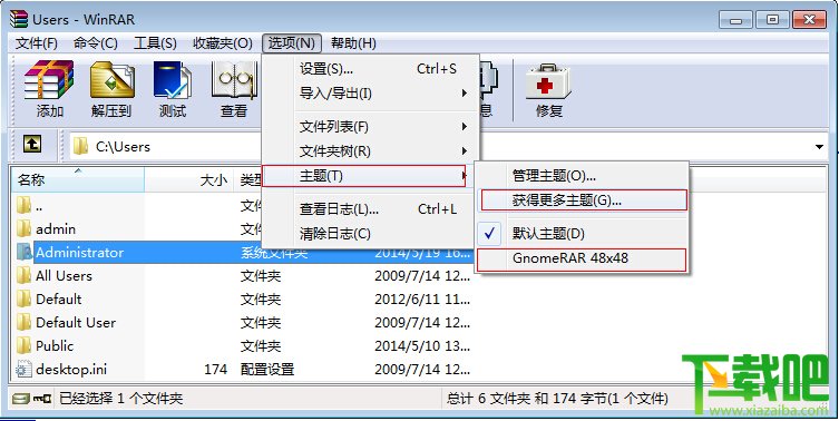 1、打开 WinRAR ,选择菜单“选项 / 主题 / 获得更多主题”。